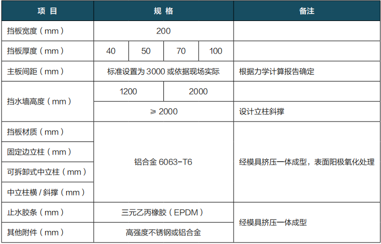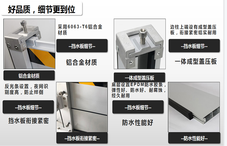 擋板及固定立柱材質為鋁合金 6063-T6,防水密封膠條為三元乙丙, 最大擋水高度 1800mm ,