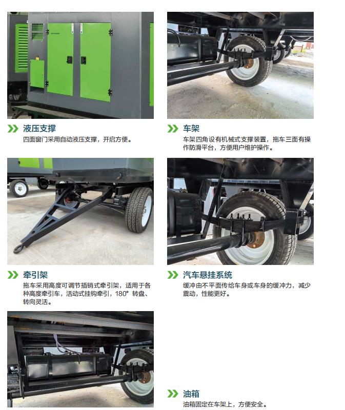 高速應急移動電站為部隊和應急移動電站用戶設計的新一代高性能高速移動電源車,采用高強度重載設計,整體框架采用高強度重載力學設計,主體全掛式結構,分為二輪和四輪。產品設計安全合理, 符合國家標準, 適合軍工、快速應急供電、野外工程施工、搶險、救災、公路、鐵路、水利、勘采、油庫油站、部隊、通訊等各類用戶,深受廣大用戶的喜愛。 整機采用全系列高壓共軌國三發動機、永磁發電機、液晶智能控制系統、防高溫 50°散熱器、重載高強度移動靜音拖車,優越的整體設計、生產、裝配,全產業鏈產 品,服務更有保障,高性能重載設計更適合高頻率使用行業。尊崇的國際品牌,將為 客戶提供更好的服務, 源源不斷地為客戶創造價值, 為推動中國移動電力產業的整體 技術發展和進步作出貢獻。 該移動電站設有燃油箱、懸掛裝置、牽引裝置及行走和輔助支撐裝置等,并可按用戶 要求增設電纜裝置及其他輔助設備。車箱尺寸根據規格大小而定, 顏色可由業主自定, 確保美觀。設計獨具創新,機動性高、重心低,制造精良、外形美觀、結構緊湊、安 全可靠。